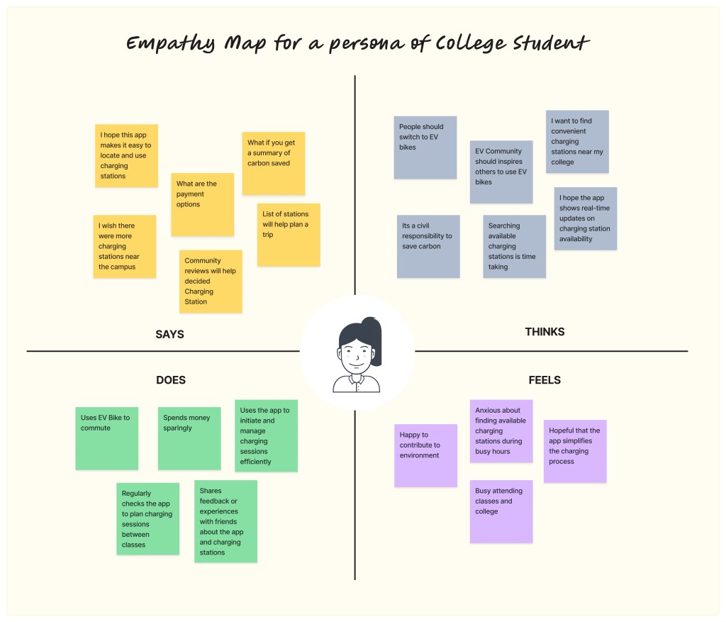 Empathy Mapping: To understand the emotional, cognitive, and behavioral patterns of EV users. This helped visualize what users say, think, do, and feel during a charging journey.